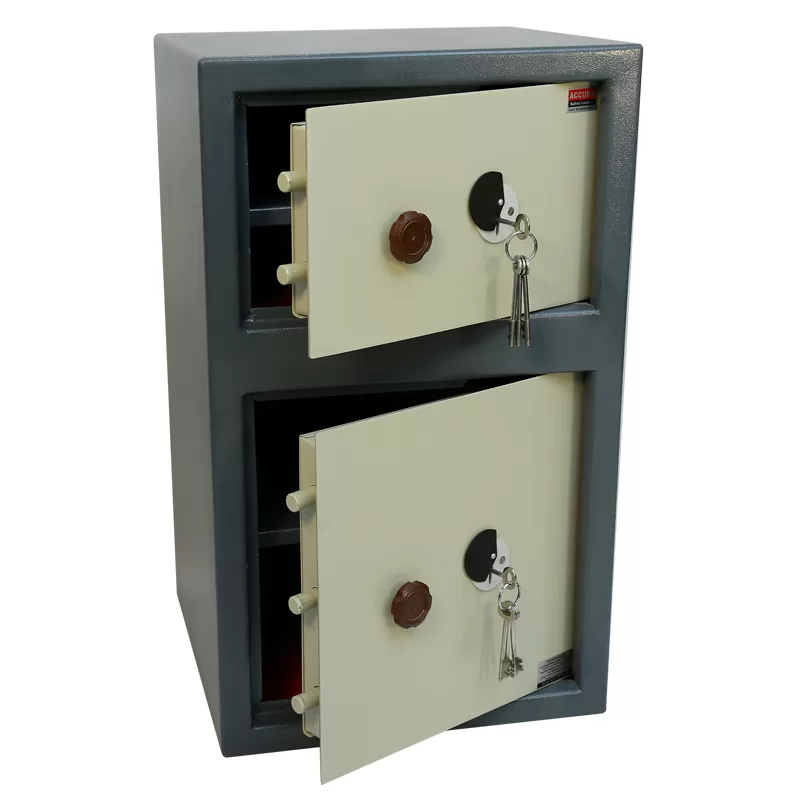 This model has dual locking system which allows customer to operate with regular and master keys simultaneously like a bank locker. The master key protects the valuables even if the regular keys are lost. In this model you will have two different cabinets with separate locking system.